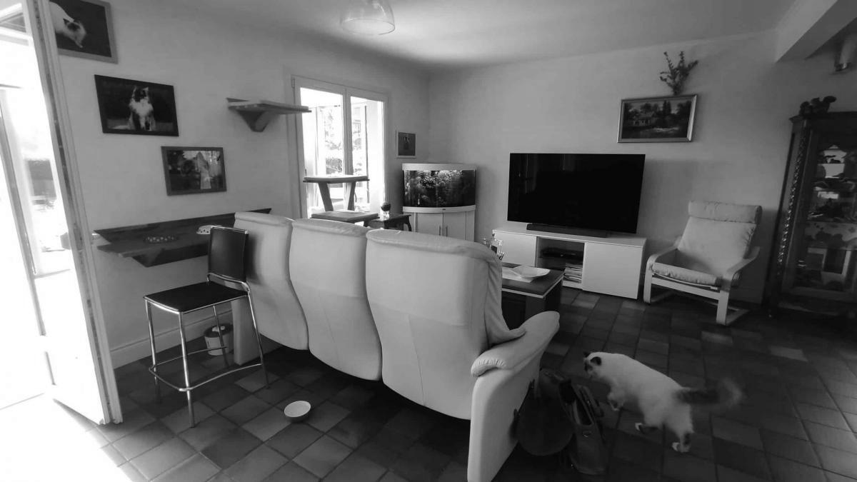 Mais, avant d’y accéder, on trouve leur ancien salon. Ils s’en servent principalement l’hiver et occupent la partie repas comme bureau pour le télé travail.