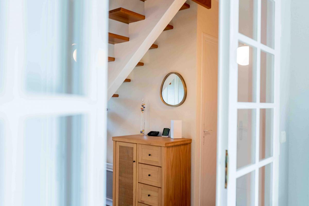 Dans cet espace, je leur conseille d’habiller la partie sous l’escalier en ajoutant un meuble de rangement ainsi qu’un miroir et quelques décorations.
