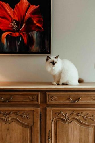 Nous avons allégé le salon de ces quelques meubles/vitrines pour habiller le fond de l’espace repas.