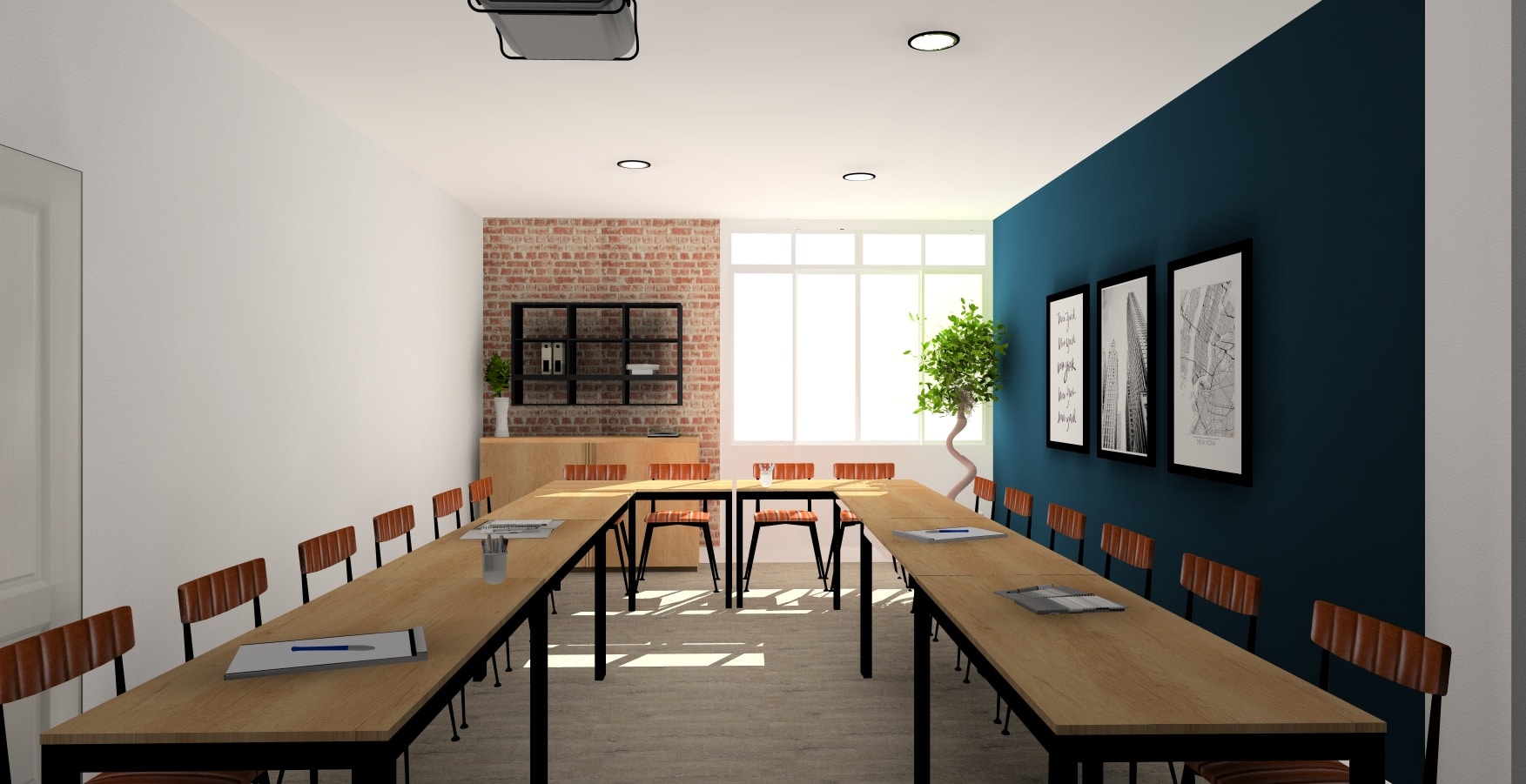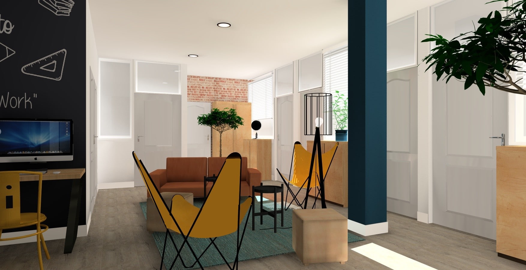 Suite à une première visite des bureaux, j’ai pu dégager l’ambiance générale souhaitée par le client. Nous partons sur des bureaux au style industriel avec un bleu électrique comme ligne conductrice, des accessoires jaune moutarde pour le pep’s et un papier peint brique pour apporter un peu de caractère à l’ensemble.