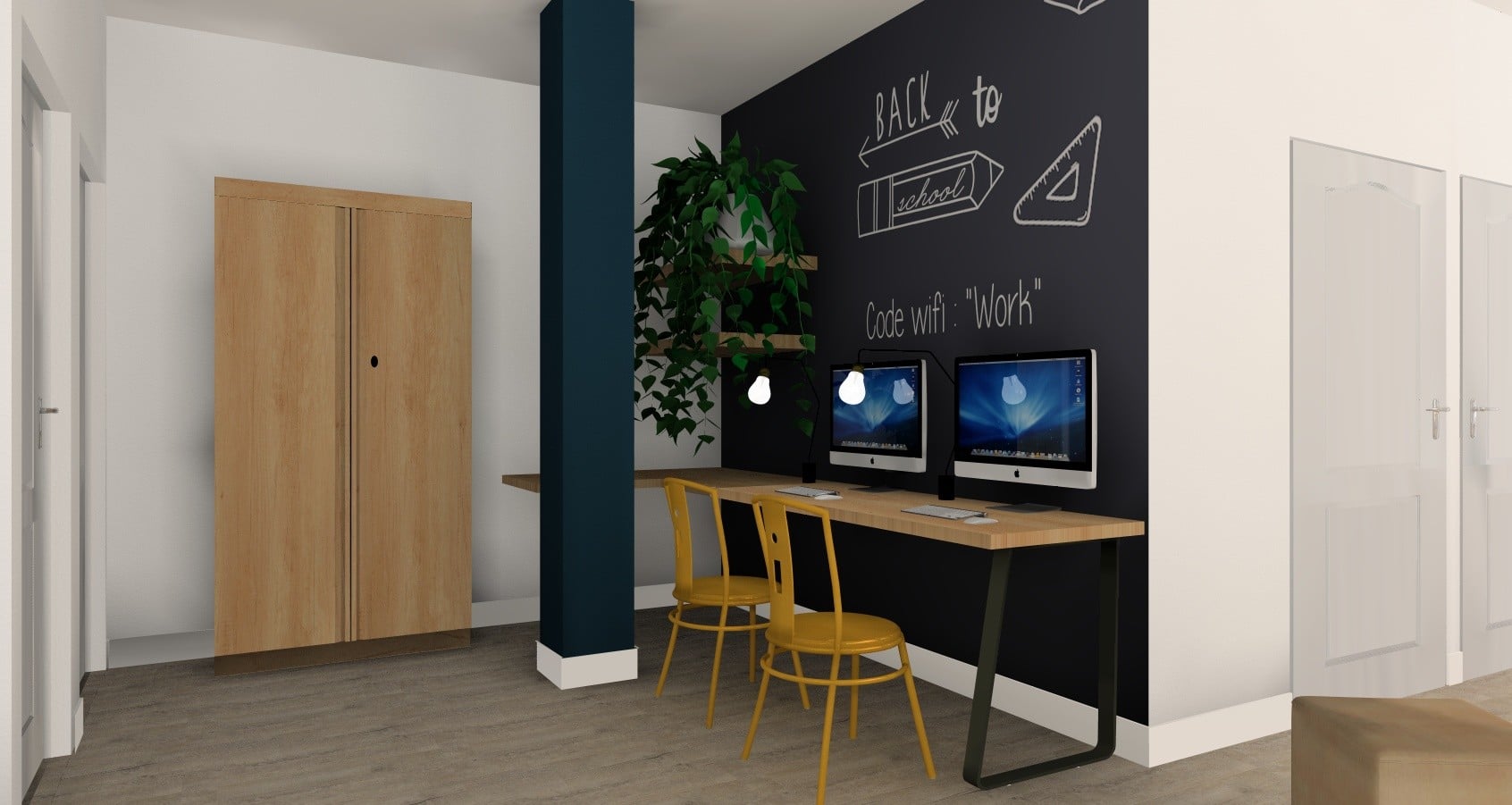 Deux grands bureaux ainsi qu’un troisième divisé en deux sont aménagés avec des planches de bois et des pieds en métal.