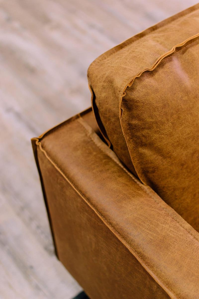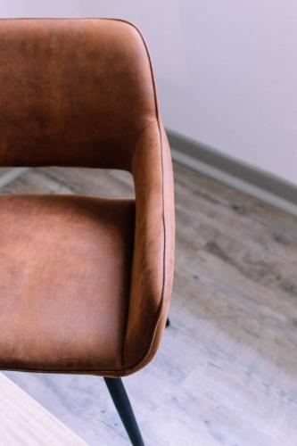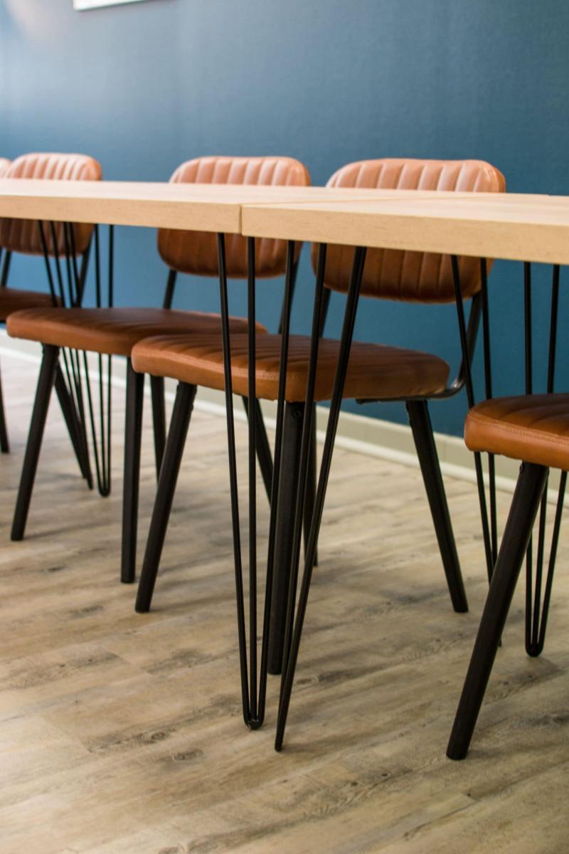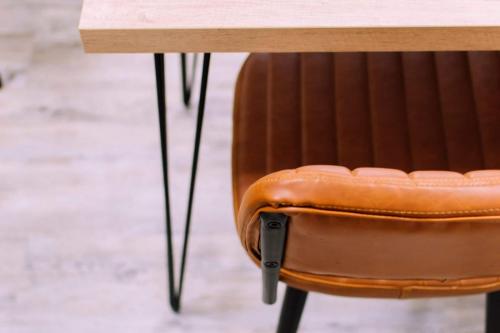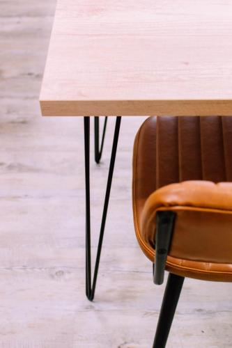 J’ai choisi des assises confortables en cuir et l’ébéniste a créé des tables sur mesure à l’aide de plateaux en bois et des pieds en métal de La fabrique des pieds.
