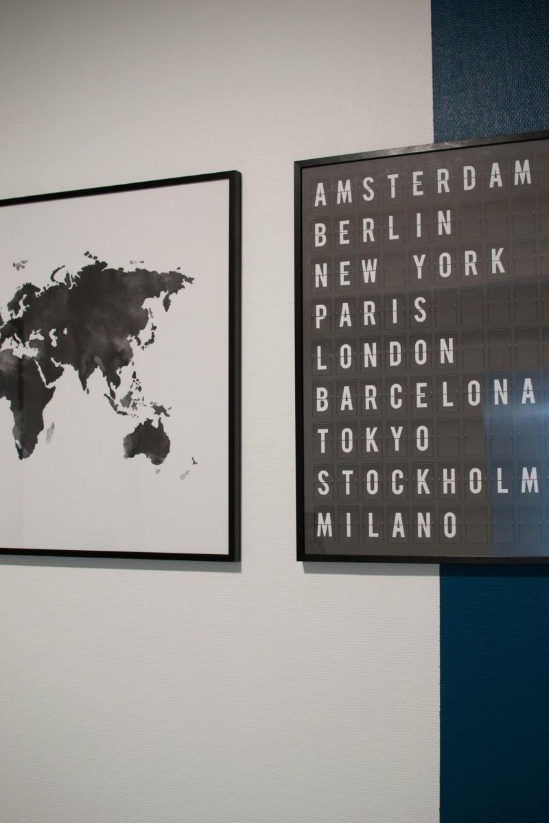Suite à une première visite des bureaux, j’ai pu dégager l’ambiance générale souhaitée par le client. Nous partons sur des bureaux au style industriel avec un bleu électrique comme ligne conductrice, des accessoires jaune moutarde pour le pep’s et un papier peint brique pour apporter un peu de caractère à l’ensemble.