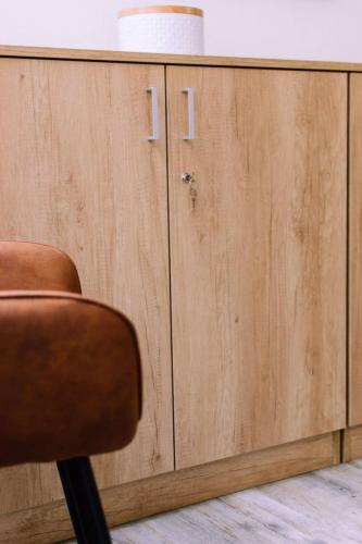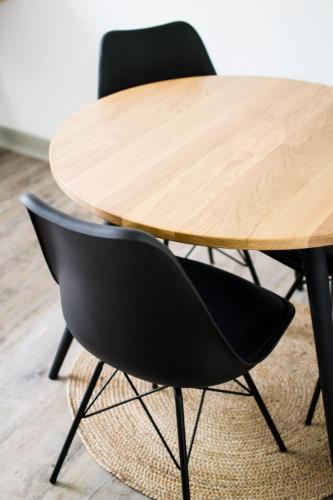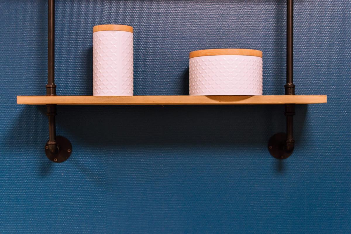 Un mange debout ainsi qu’une table permettent aux utilisateurs des locaux de déjeuner ensemble. Pour le rangement, des étagères ouvertes permettent d’alléger l’espace.