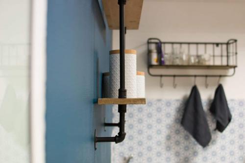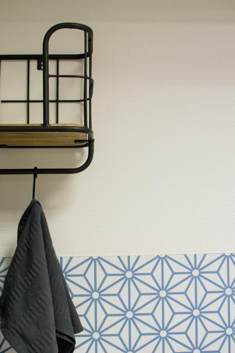 Côté revêtement, un carrelage adhésif vient recouvrir le carrelage près de l’évier et une frise est ajoutée contre le bar pour faciliter le nettoyage.