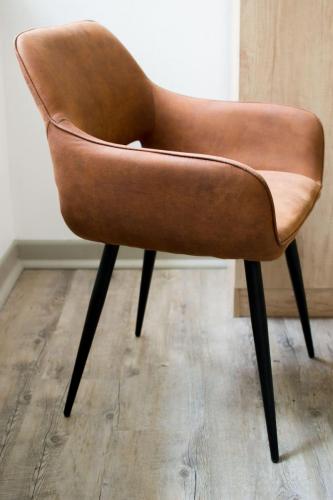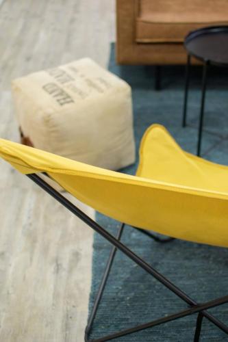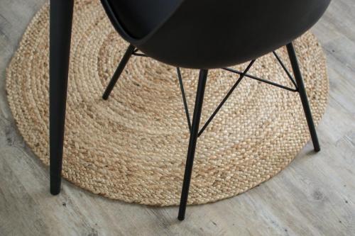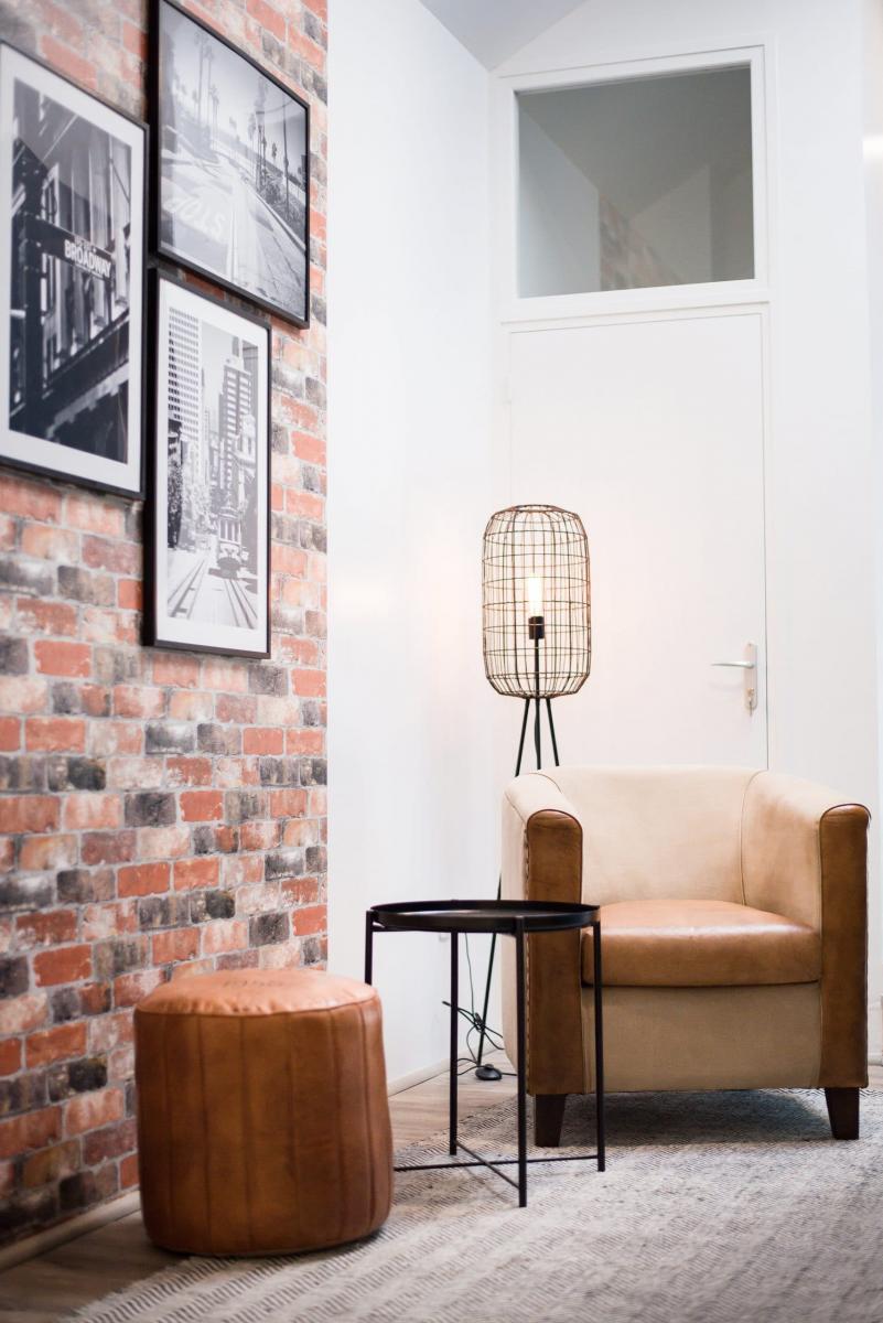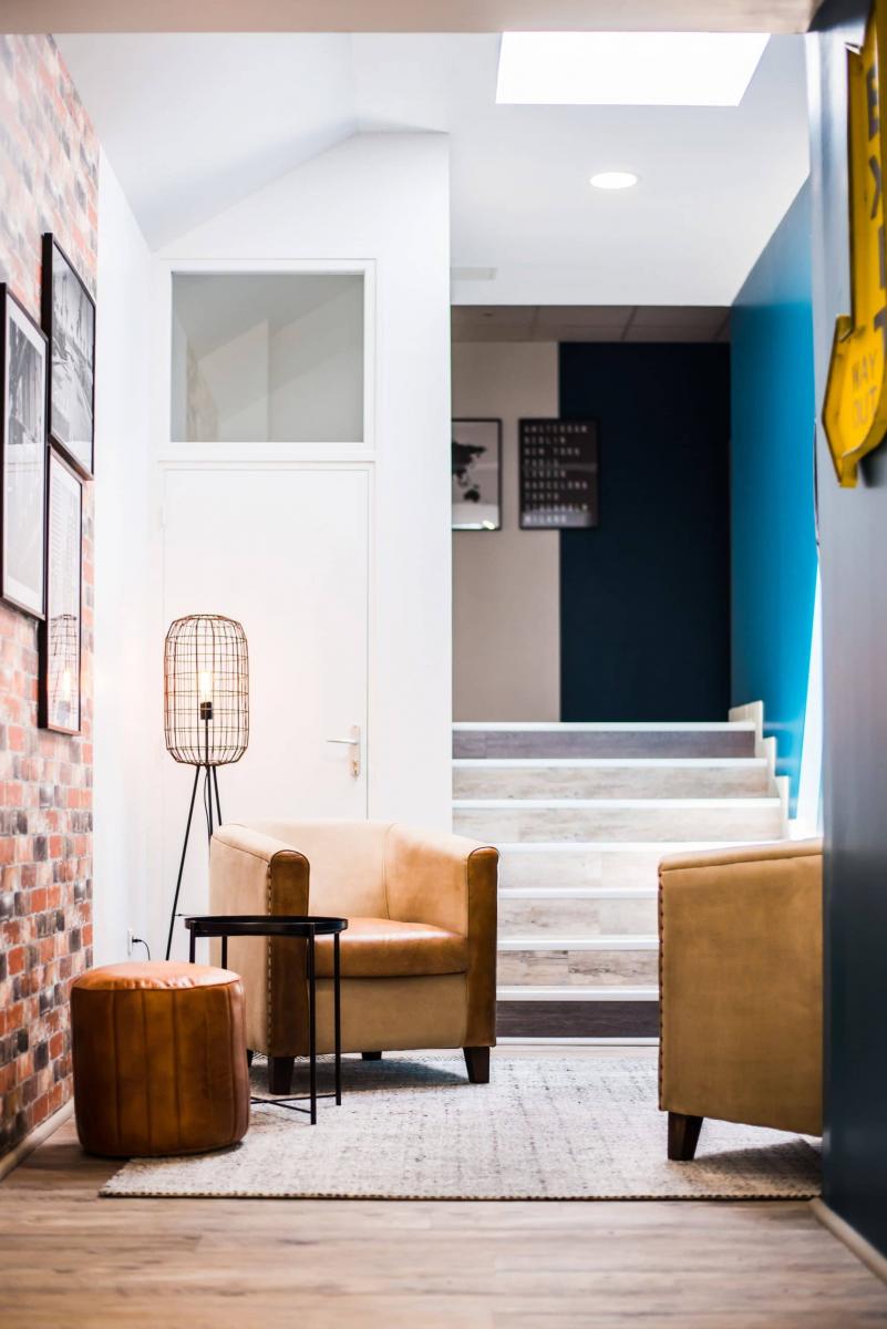 En bas des escaliers se trouve un petit espace détente qui donne le ton du projet. En effet, il regroupe tous les codes du style choisi pour l’ensemble.
