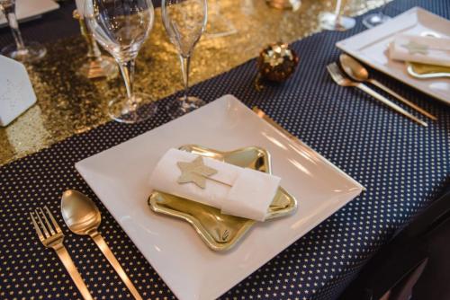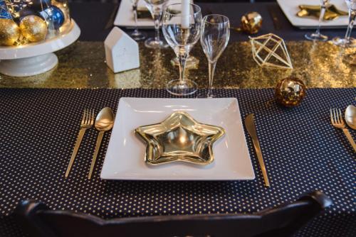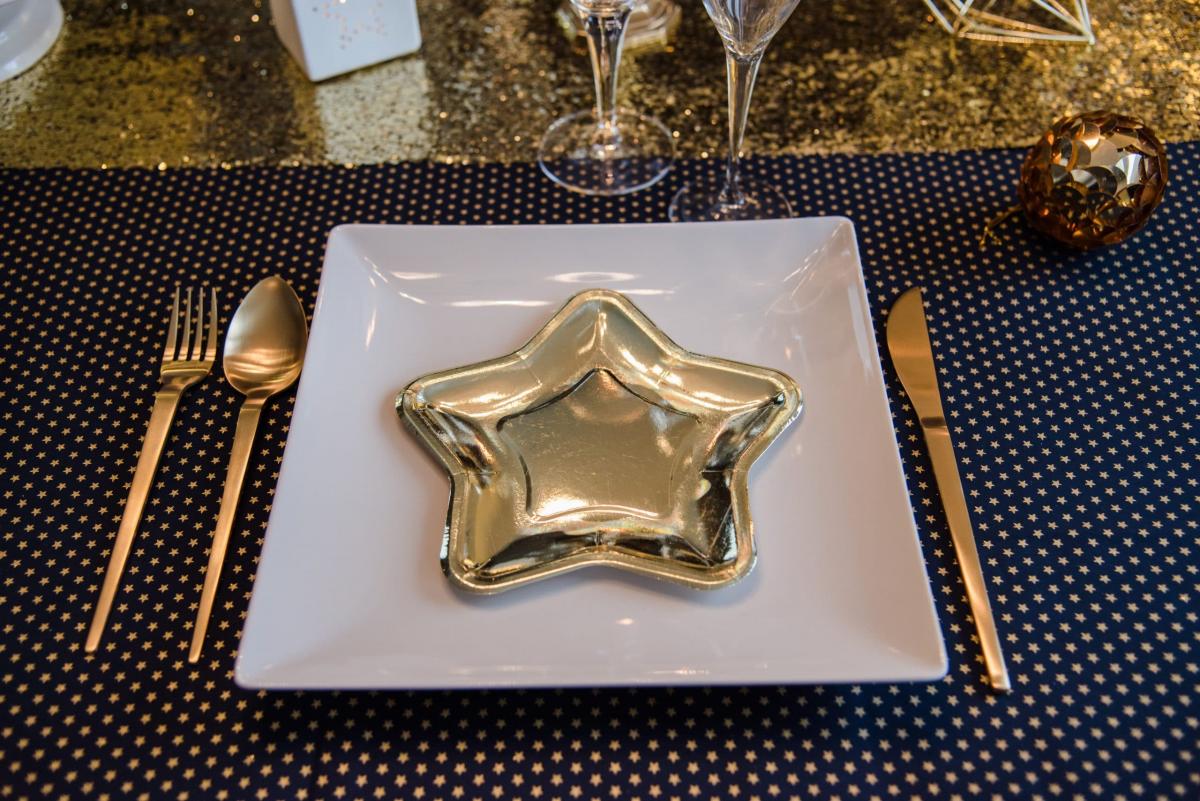Côté vaisselle, de simples assiettes blanches, des assiettes étoiles [Hema] et des couverts dorés [Sostrene Grene].