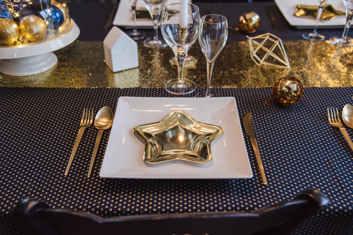 J’ai donc choisi une nappe bleu nuit avec un motif étoilé et un chemin de table à paillettes dorées [Top déco] pour habiller la table.