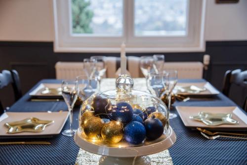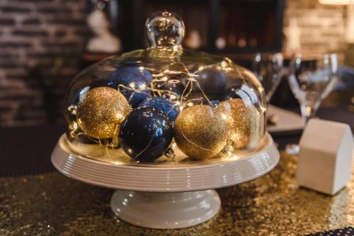 En bout de table, j’ai utilisé un présentoir à pâtisseries agrémenté des boules bleu et doré pour terminer la décoration.