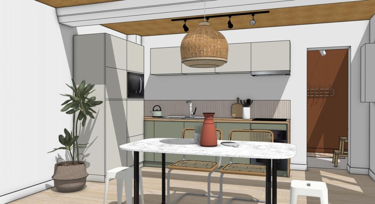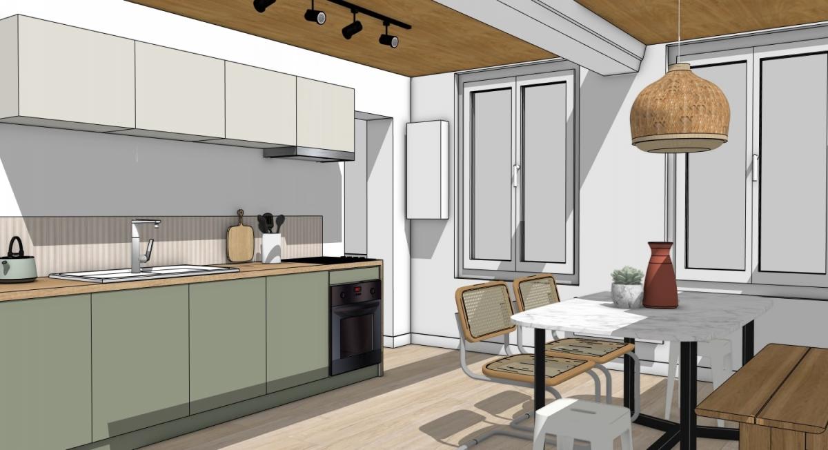 L’espace repas sera placé dans la cuisine afin de libérer un grand salon, qui pourra aussi servir de 3ème chambre d’appoint.