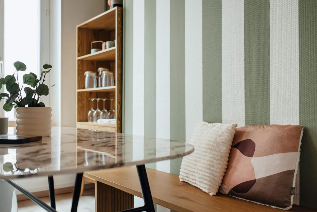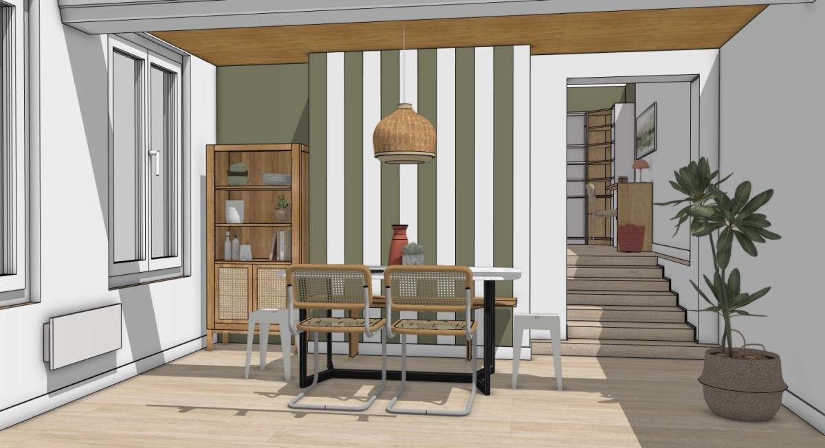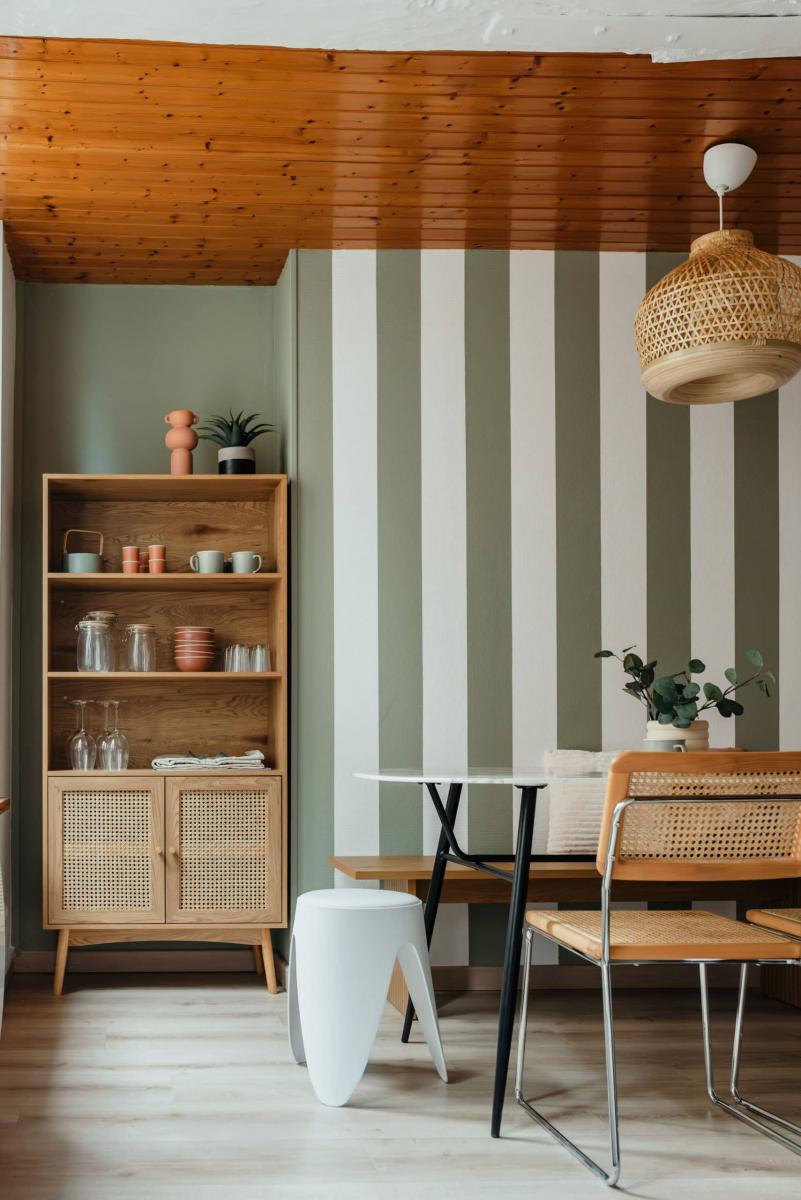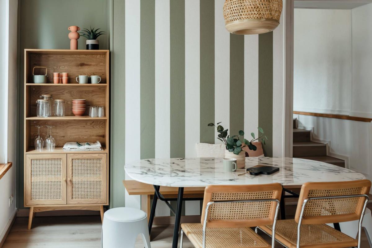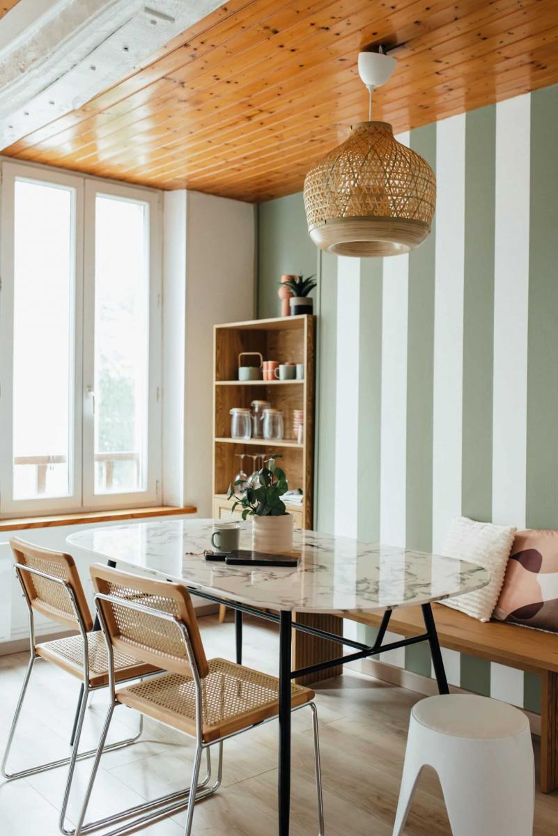 La table de repas est installée contre le mur central, souligné par une peinture bayadère vert et blanc qui vient structurer la pièce et lui donner du caractère.