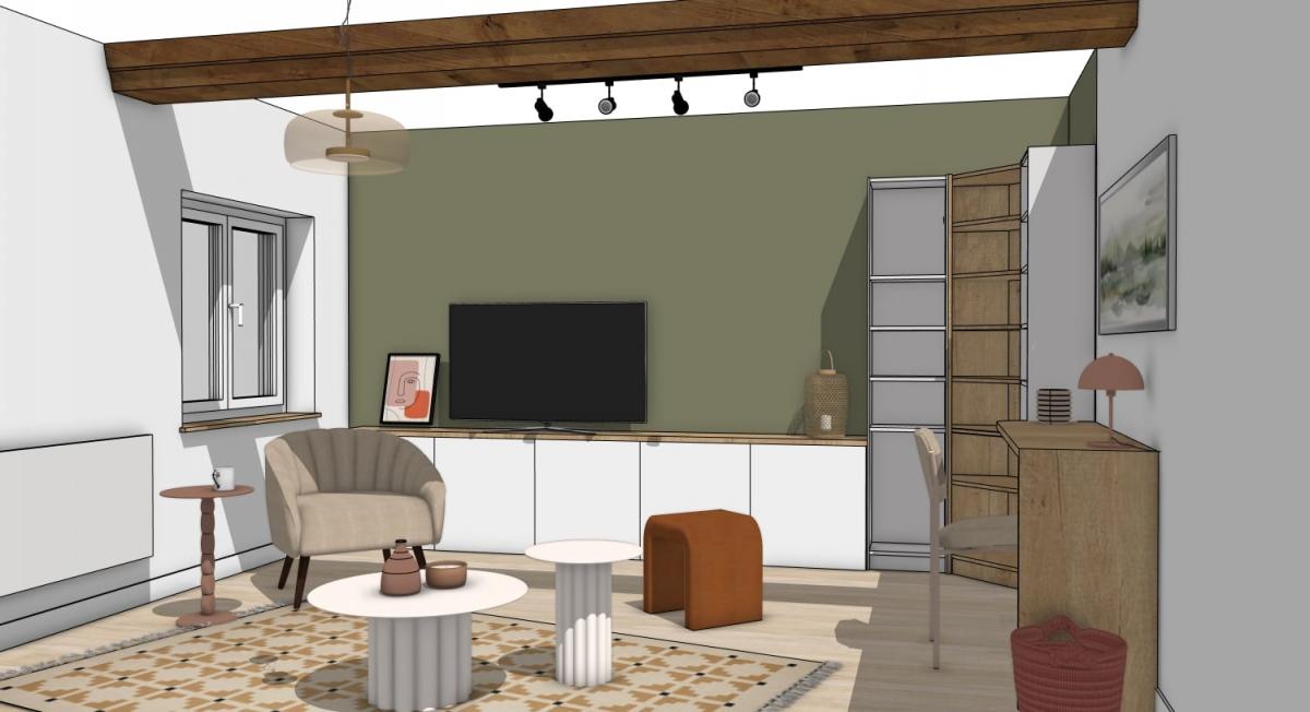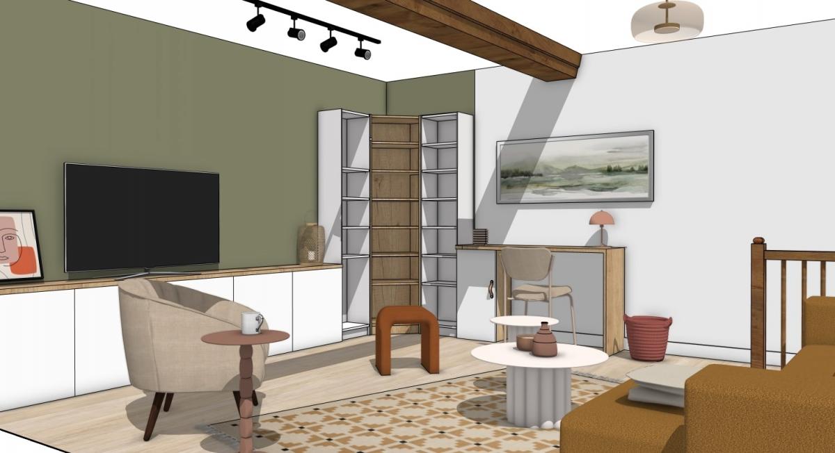 - création d’un meuble TV sur mesure intégrant bibliothèque et bureau,