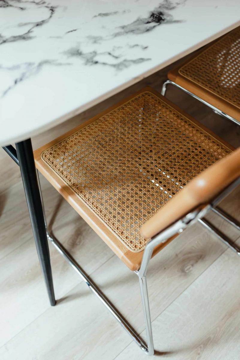 J’ajoute un banc contre le mur, une table en imitation marbre et des chaises à la structure métal et cannage.