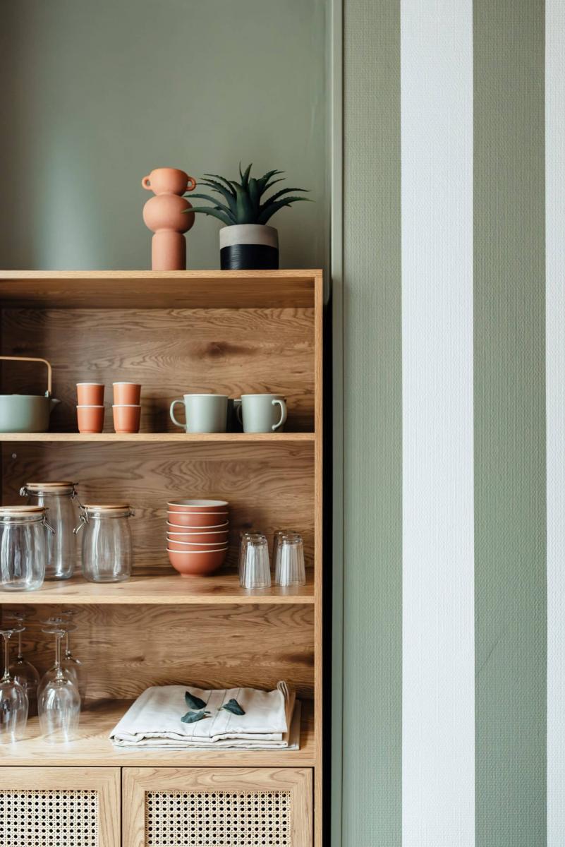 Un meuble de rangement avec des portes cannages est placé dans l’alcôve, peinte en vert, à gauche.