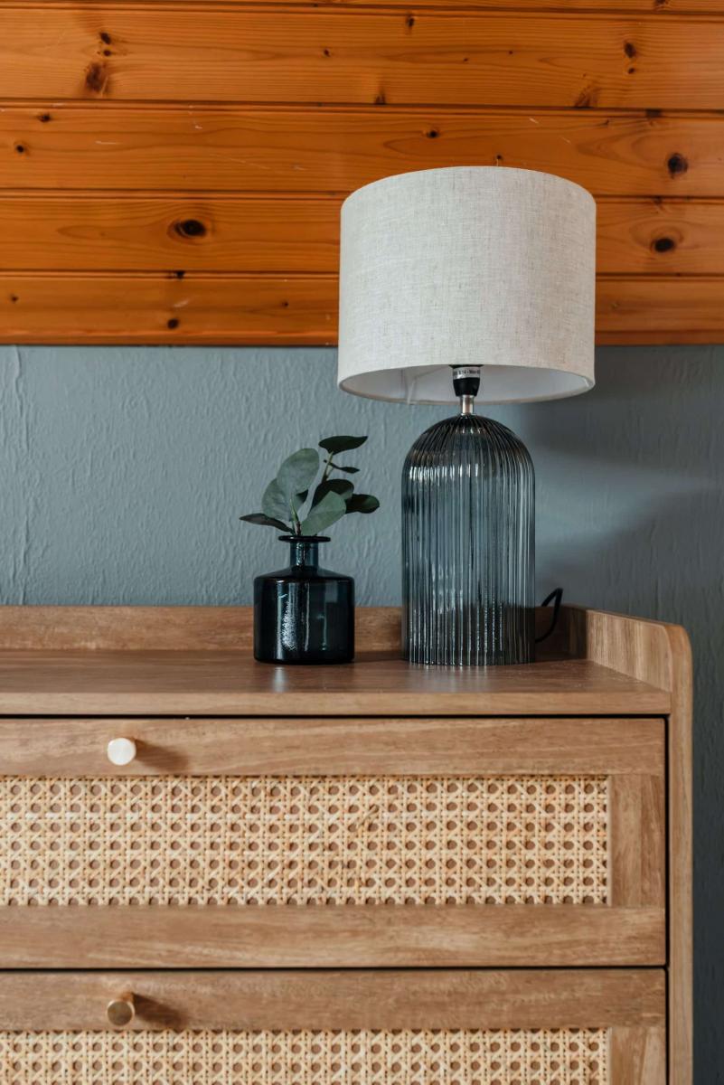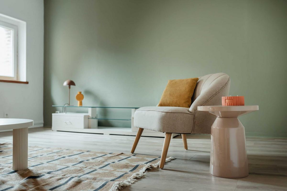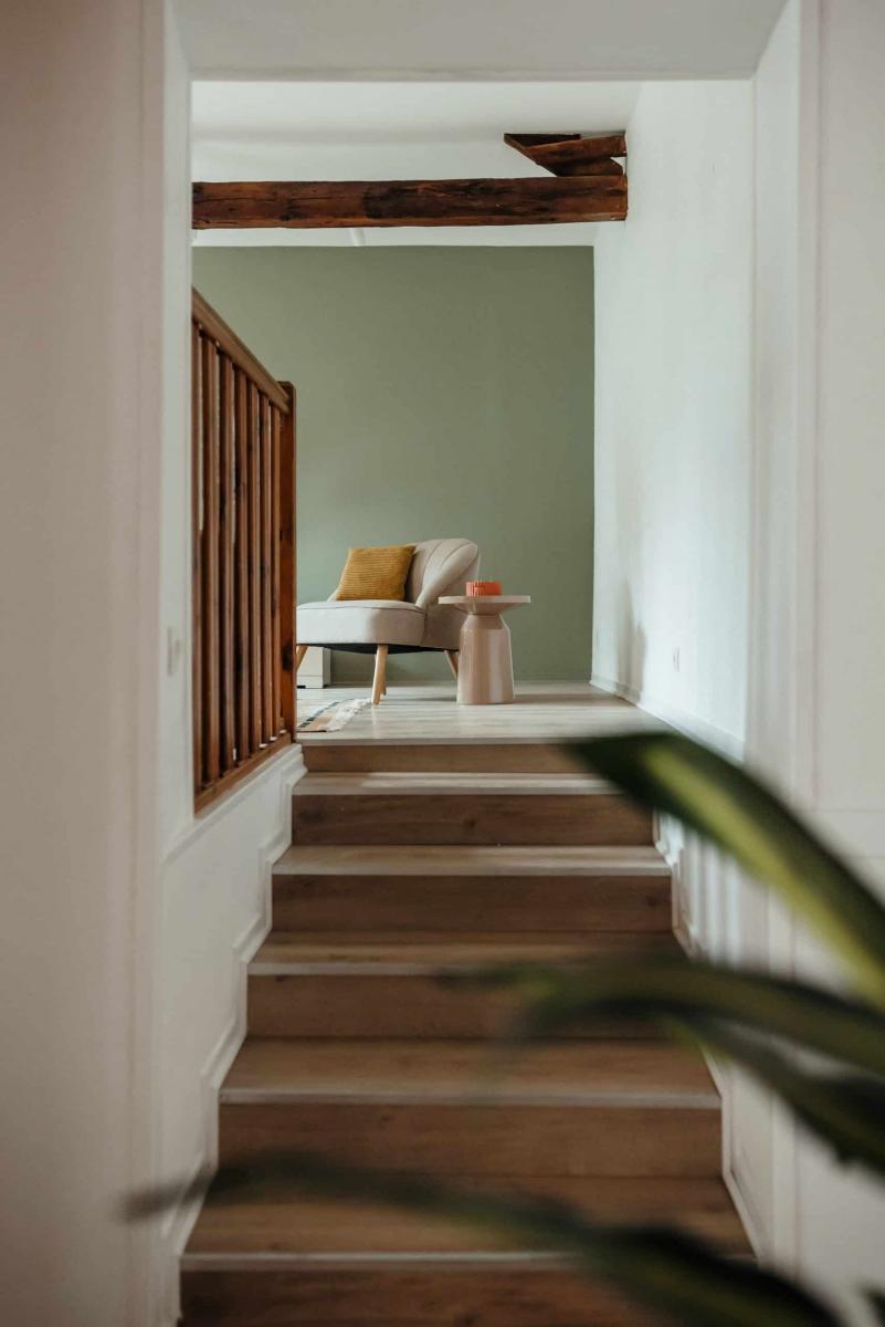 Nous avons choisi des tons naturels et chaleureux, rehaussés d’un vert froid pour contraster avec le lambris déjà présent.