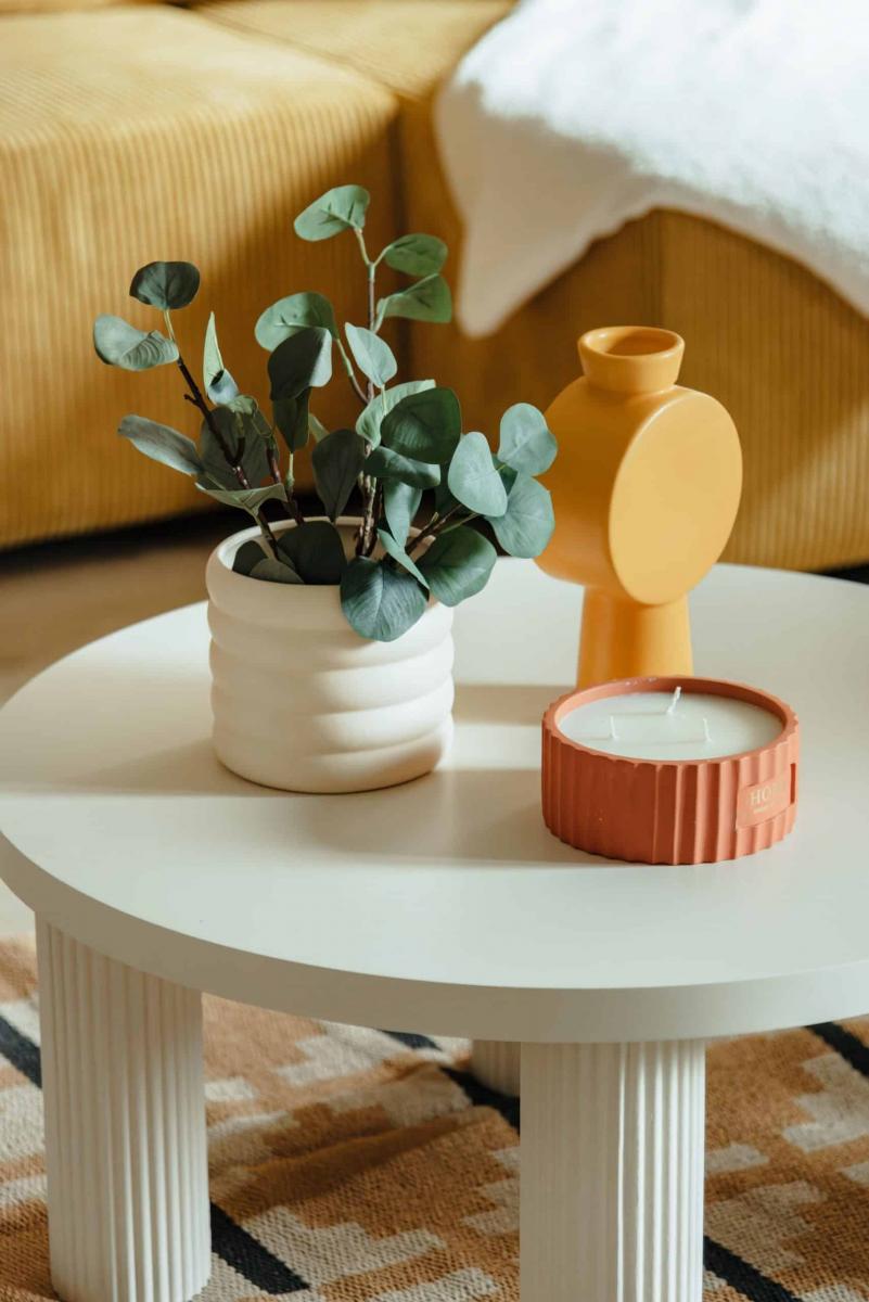 On y retrouve un grand canapé en velours moutarde, des tables gigognes imitation pierre, un fauteuil et un tapis central qui permet de lier ces différents éléments.