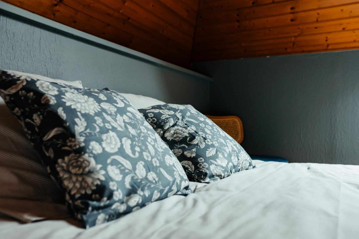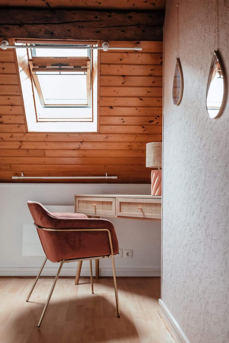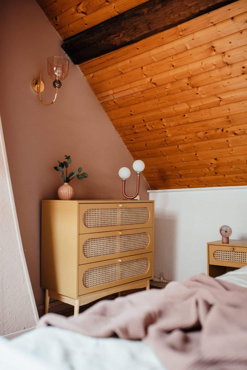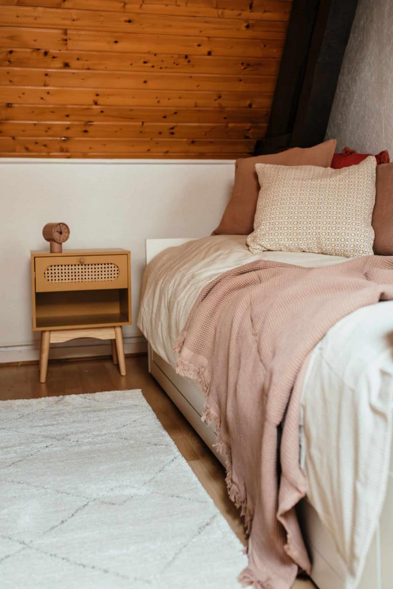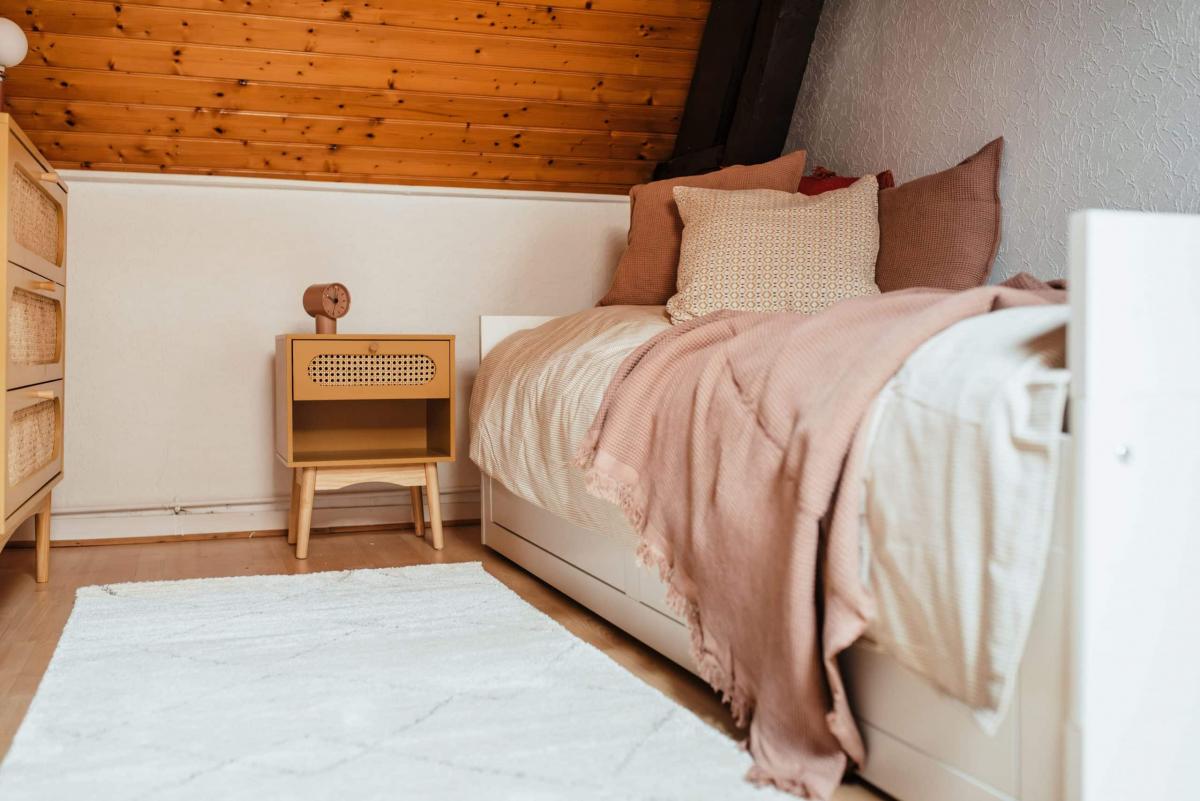 - une petite chambre dans une ambiance rose et jaune lumineuse