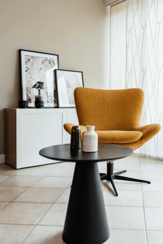 Au fond, près des baies, deux fauteuils moutarde forment une extension du salon, une nouvelle zone de repos pour profiter de la lumière.