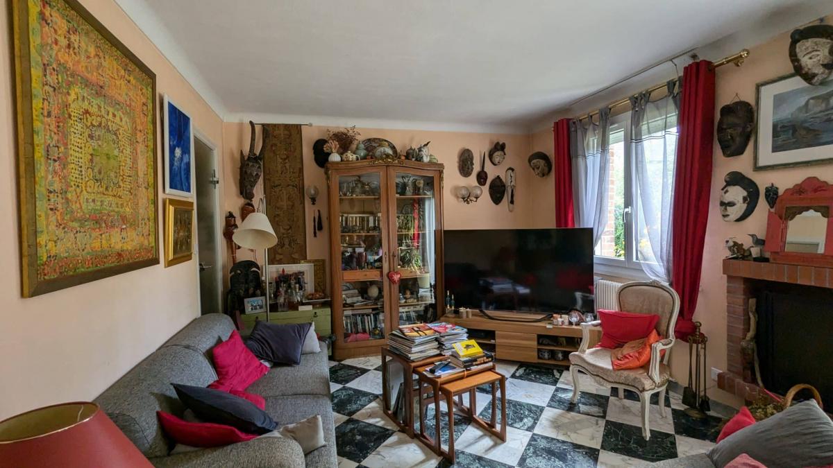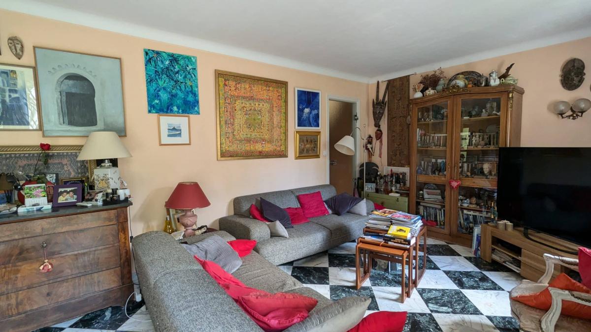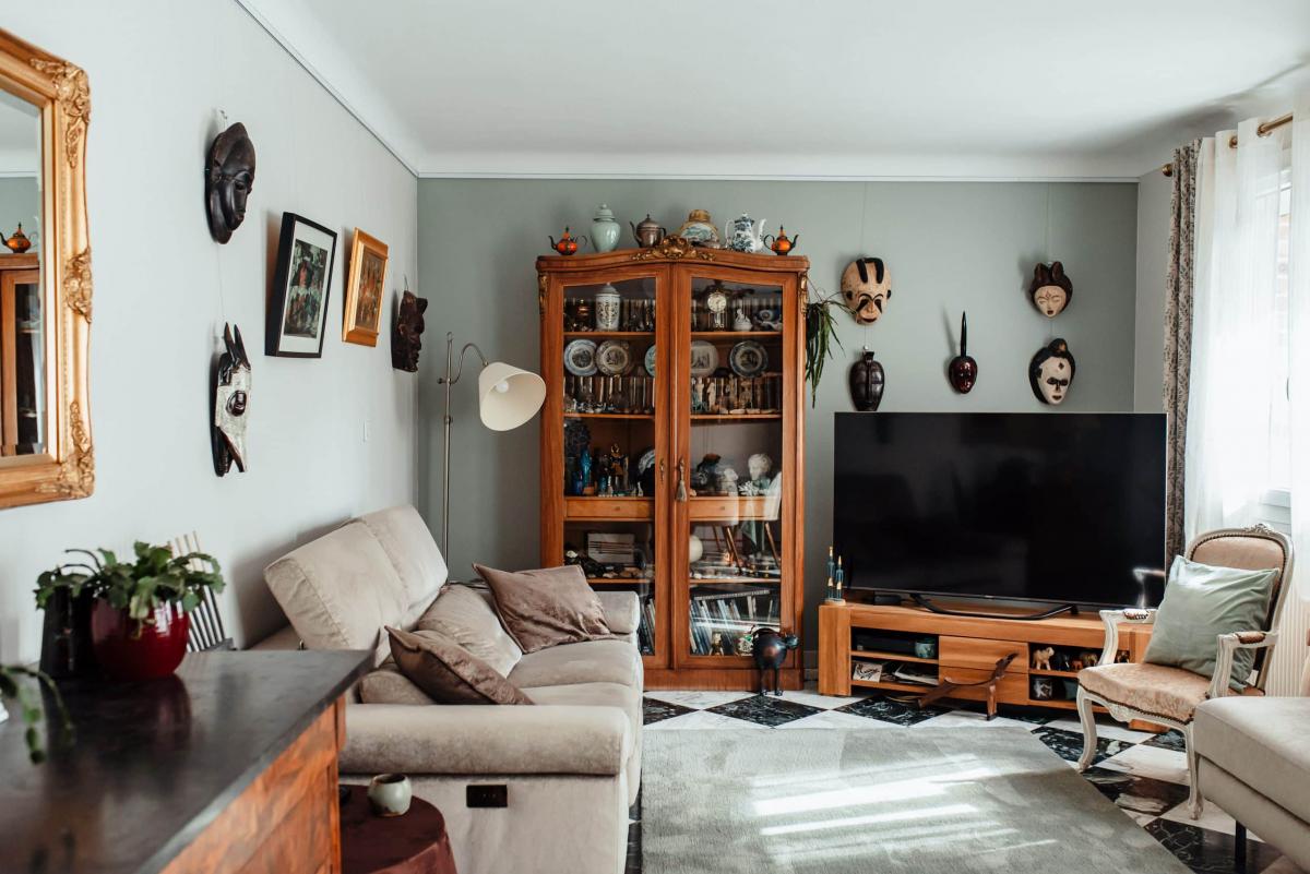 Le sol en marbre, avec sa forte personnalité, apporte une touche distinctive au séjour. Son ton froid crée un contraste subtil avec la chaleur des meubles en bois et des objets de décoration soigneusement choisis par le couple lors de leurs voyages.