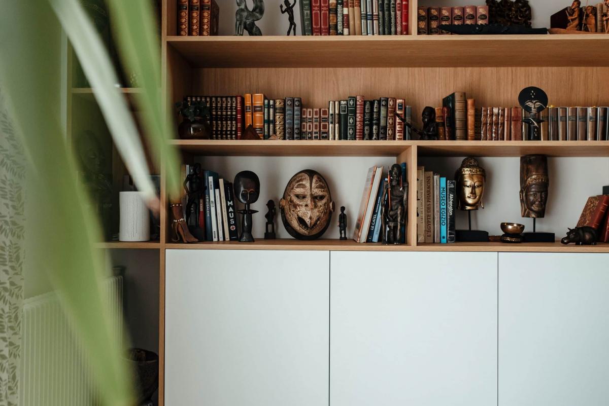 Nous avons choisi une composition mixte : un soubassement fermé pour un rangement discret et une bibliothèque aérienne au-dessus, idéale pour exposer des objets décoratifs et ouvrages.