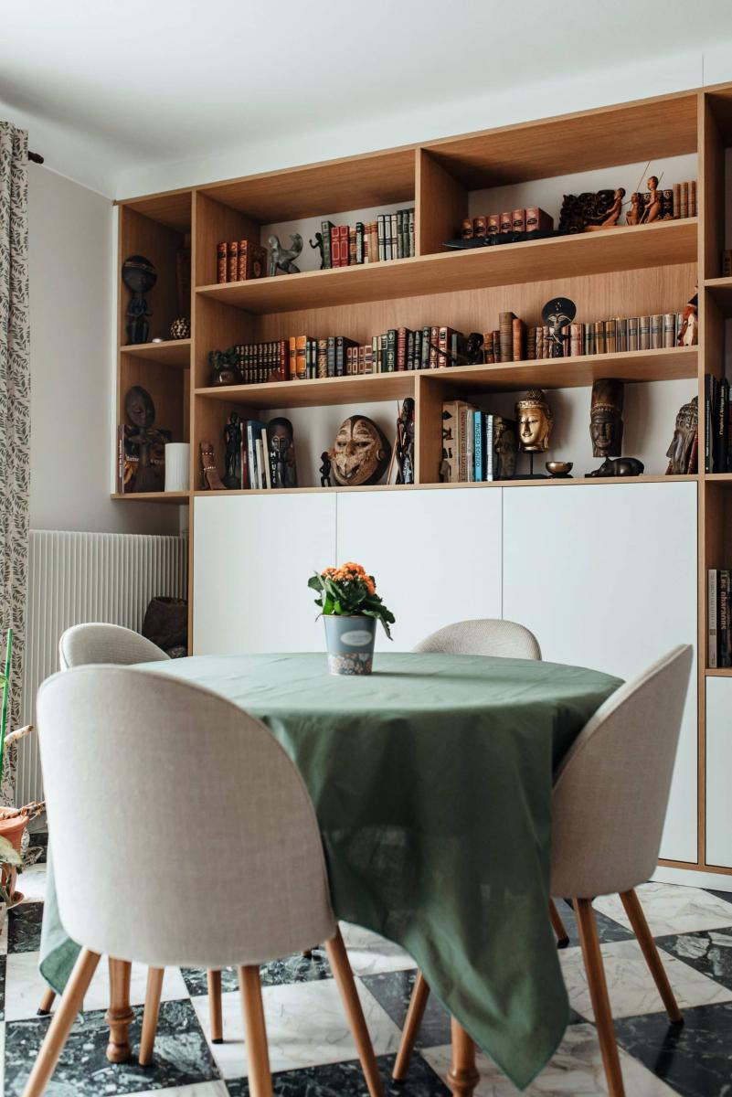 Un grand rangement sur-mesure remplace désormais le buffet de la salle à manger, optimisant ainsi l’espace et la fonctionnalité.